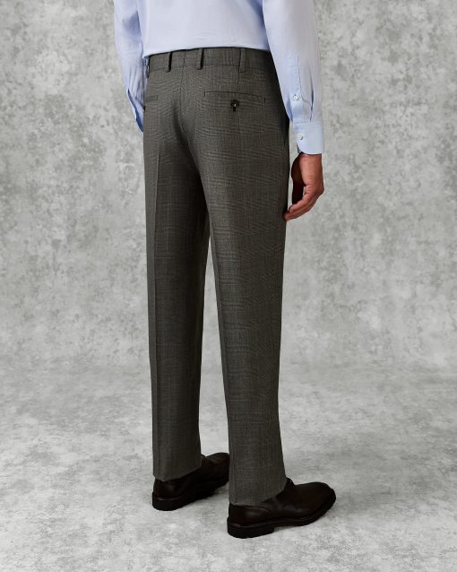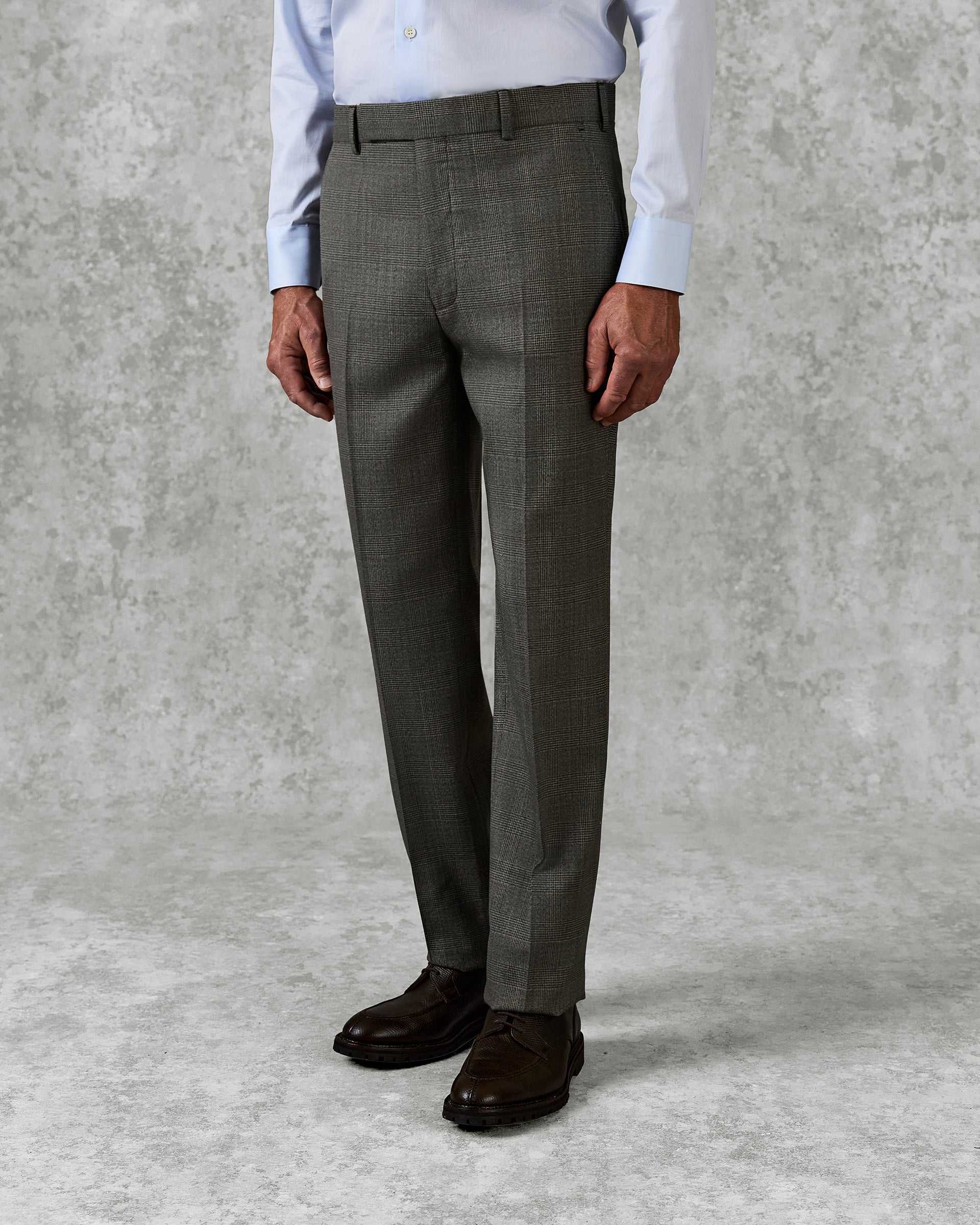 The Bushell Suit Trouser in Brown Check is tailored from 100% English-woven wool, combining classic patterning with a clean, modern silhouette. Featuring a flat front, side adjusters, and a 5cm turn-up hem, it’s finished with dark horn buttons for a touch of refined tradition.