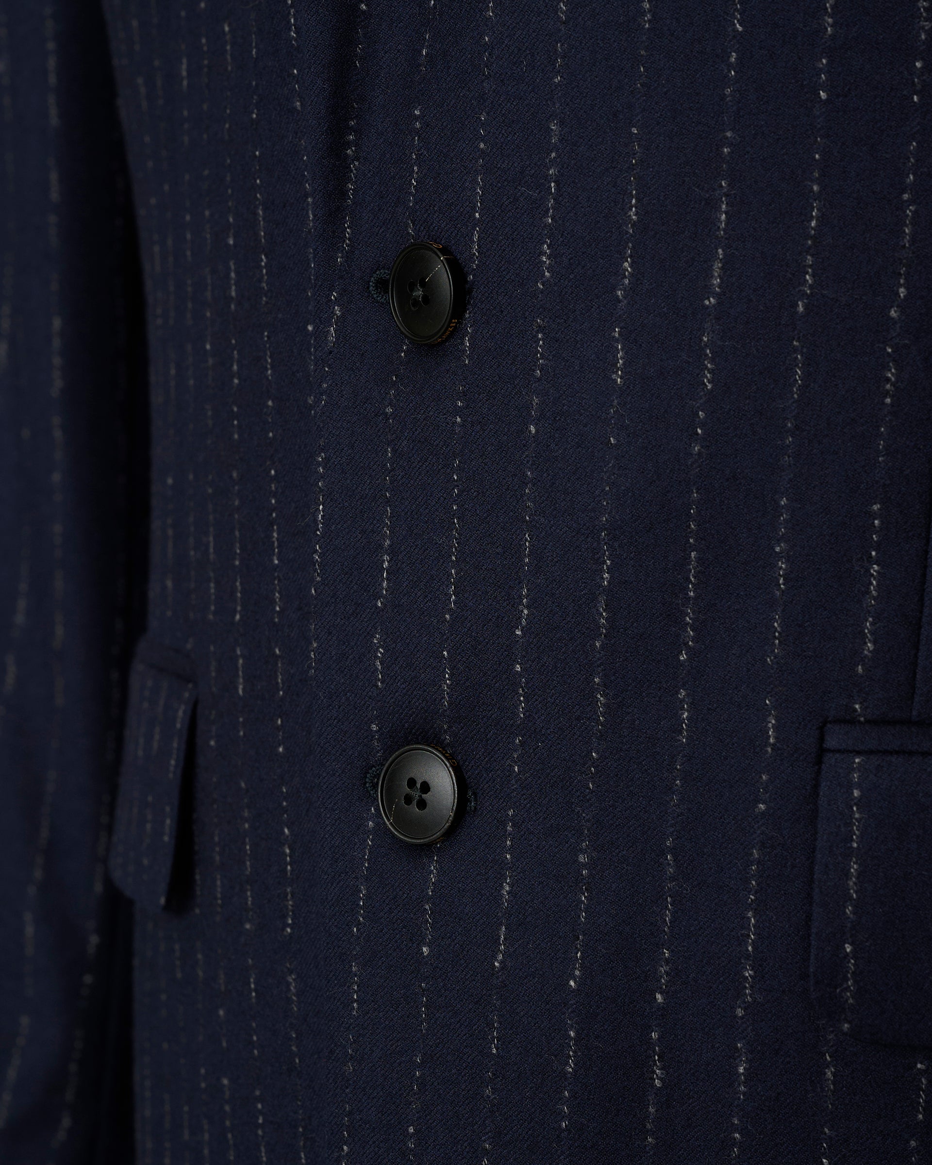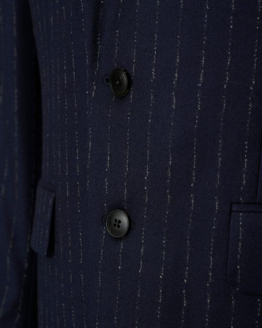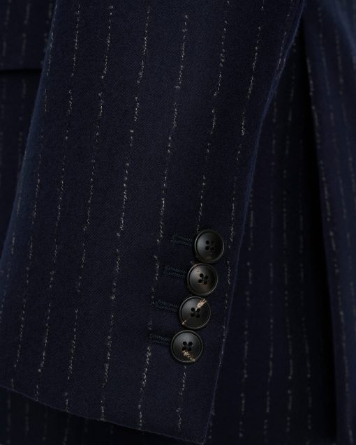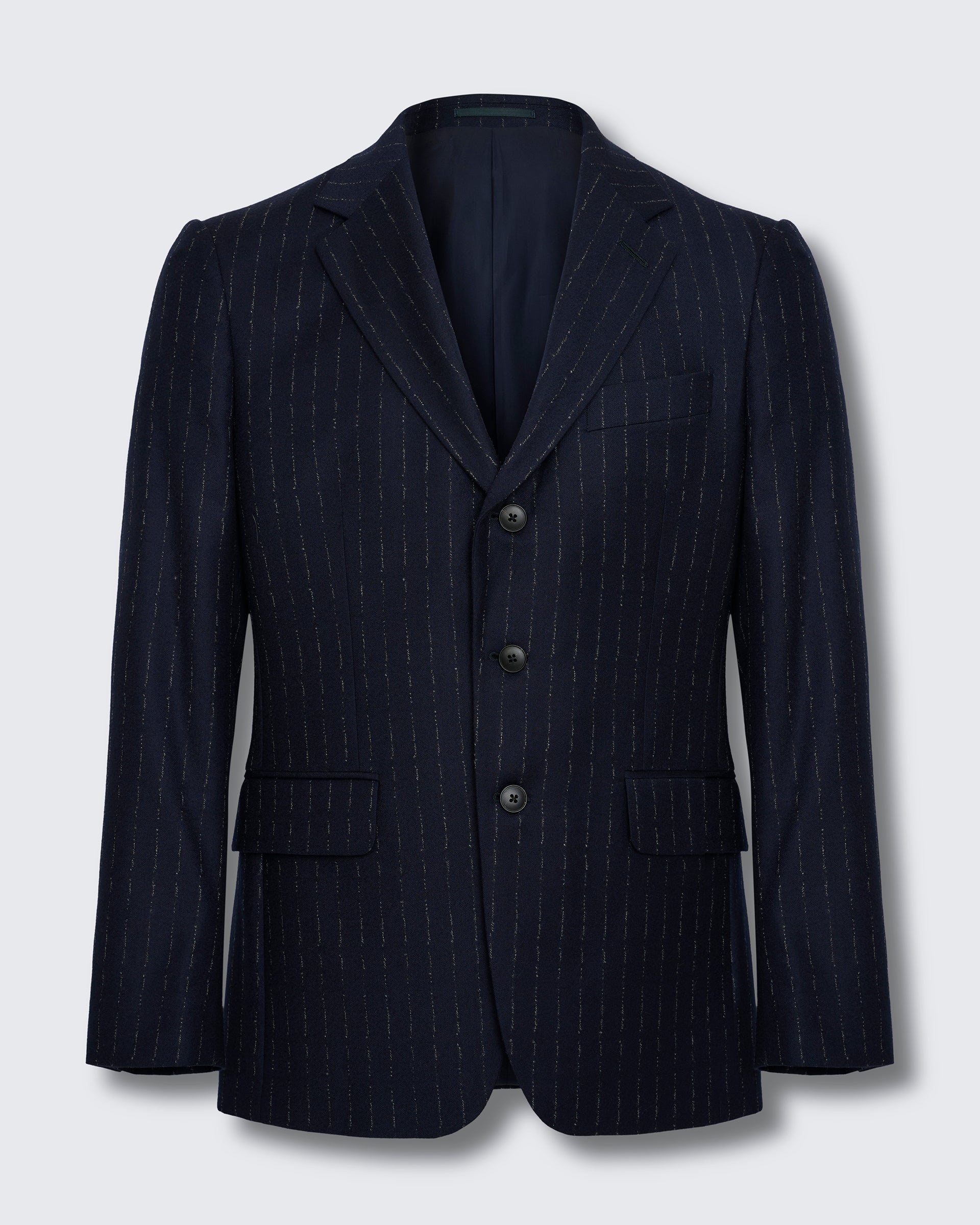 The Churchill Suit Jacket in Navy Morse Code Flannel is tailored from a refined Italian blend of wool and cashmere, offering a soft yet structured feel. With roped shoulders, flap pockets, and dark horn buttons, it’s a timeless piece that embodies classic sartorial elegance.