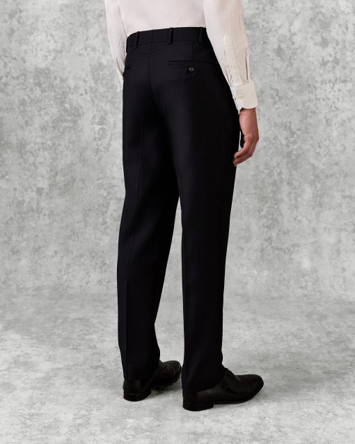The Clarke Suit Trouser in Black Twill is cut from 100% UK-made wool for a refined, tailored finish. Designed with a flat front, belt loops, welt pockets with horn buttons, and a hook-and-button closure, it’s half-lined and left with an unfinished hem for a perfect custom fit.