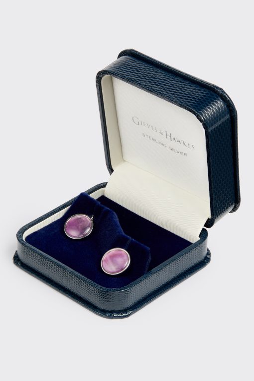 Presenting the Clint Sterling Silver Reversible Cufflinks, meticulously crafted by Gieves and Hawkes for the discerning gentleman. These exceptional cufflinks feature a unique combination of grey and purple mother of pearl and amethyst, set in 925 sterling silver. The central bespoke finding, elegantly designed in the shape of a reef knot, adds a touch of sophistication to this exquisite accessory. Each natural semi-precious stone offers a distinct hue, ensuring that every pair is genuinely unique.
