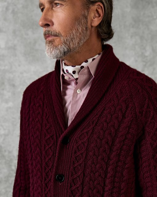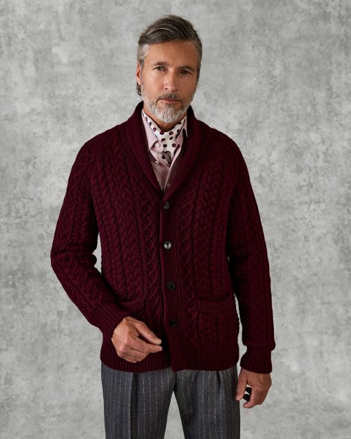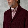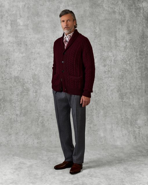 Refined and effortlessly stylish, the Crompton Cardigan in Burgundy by Gieves and Hawkes embodies British elegance. Crafted meticulously with a 3-gauge cable knit, this cardigan features ribbed welt pockets and a distinguished shawl collar, ensuring both warmth and sophistication. The luxurious texture and handmade feel are perfectly complemented by five buttons, offering a perfect balance between casual charm and timeless design.