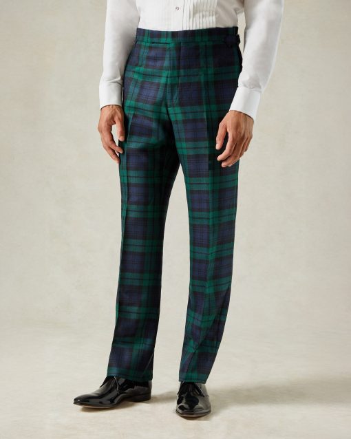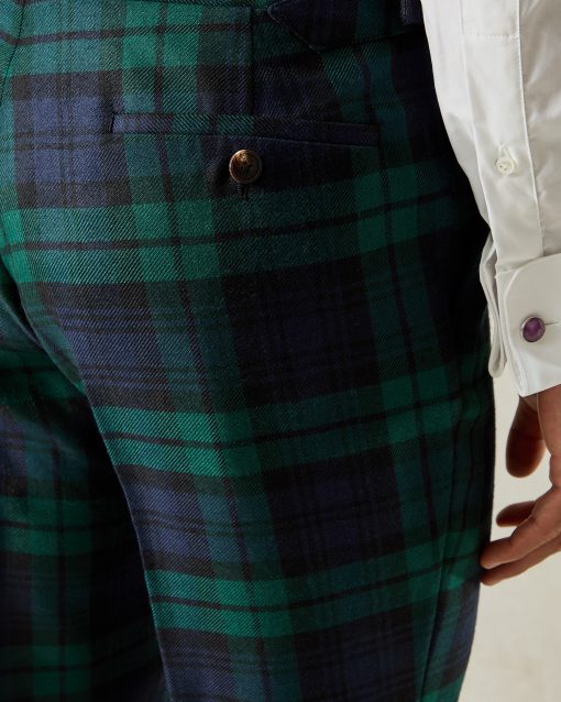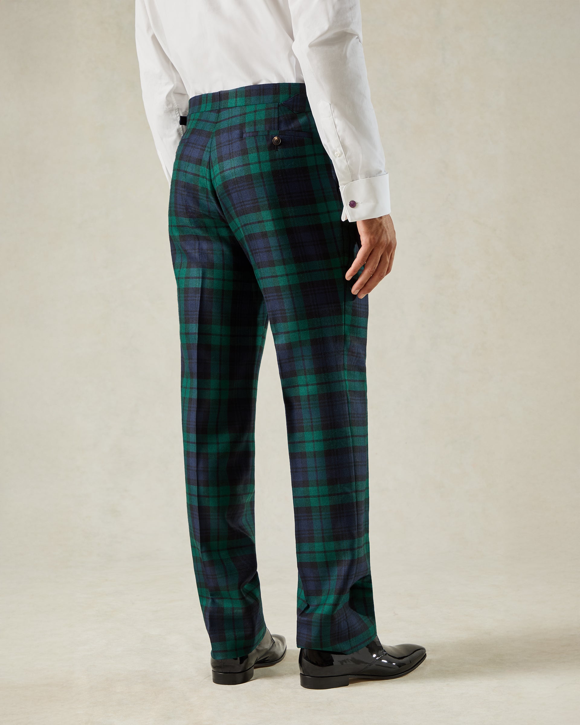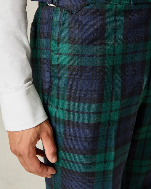 The Fyler Trouser in an exquisite blackwatch tartan pattern, suitable for any distinguished gentleman’s wardrobe. Designed with a flat front and featuring side adjustors with a dinner split. The precise hook closure, two welt pockets with buttons along with slanted pockets detailed with AMF stitching along the pocket, speaks volumes of Gieves and Hawkes craftsmanship.