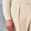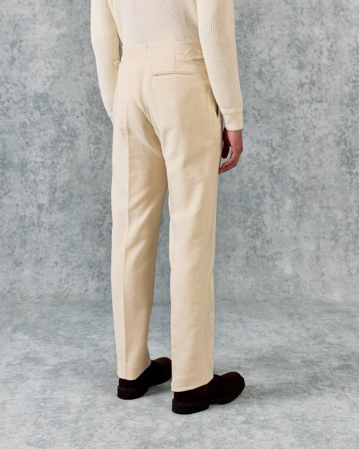 The Hayter Pleated Trouser in White Moleskin is made from premium British-woven 100% cotton, combining softness with structure. Featuring a deep pleat, turn-up hem, and side adjustors, it delivers timeless tailoring with a contemporary edge.
