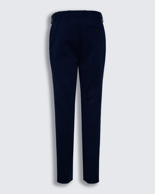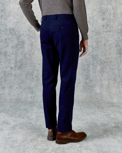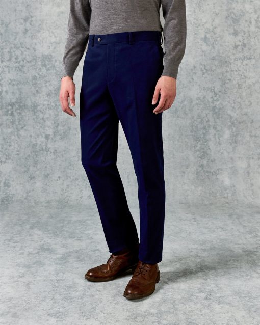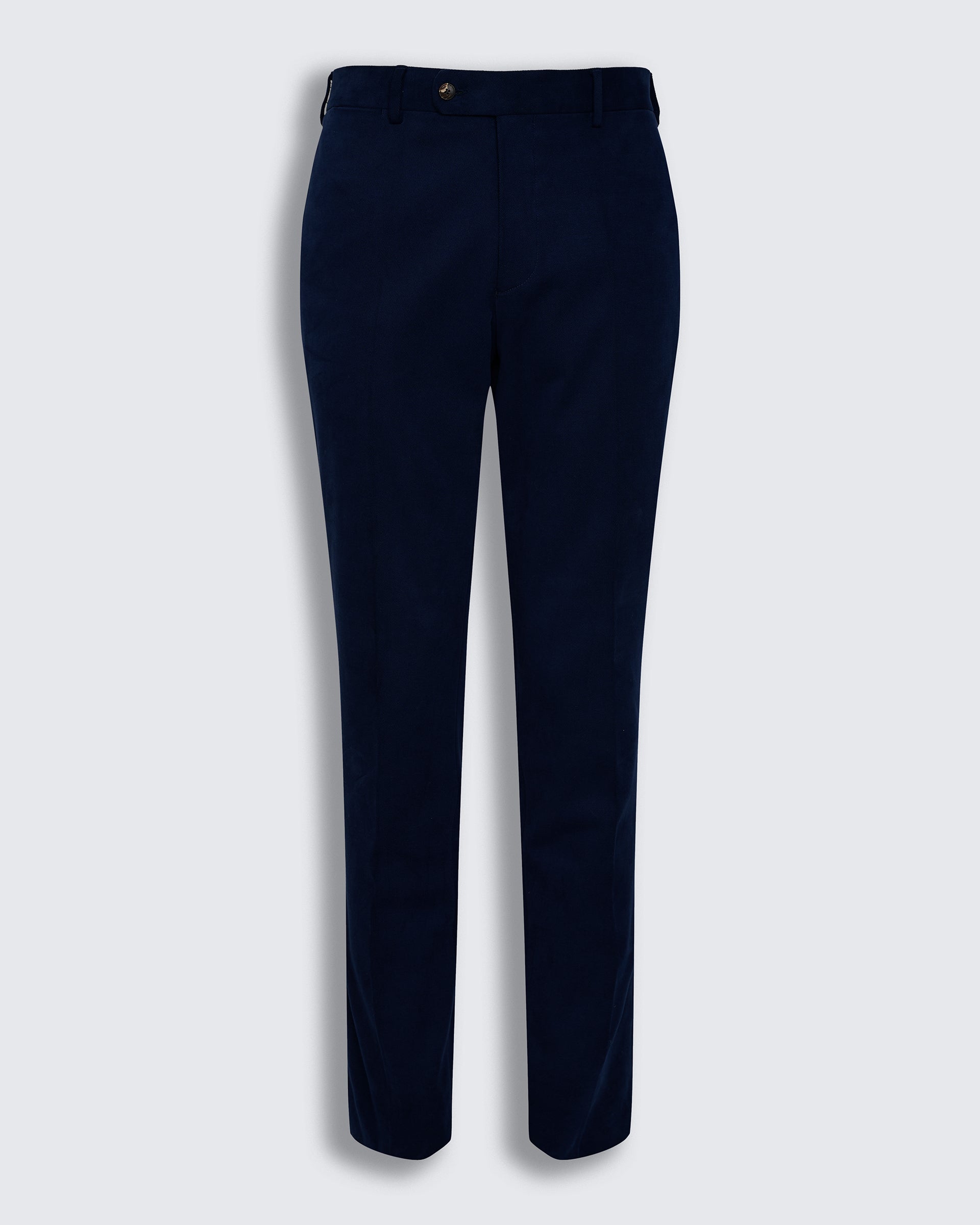 The Kirby Trouser in Navy Moleskin is crafted from Italian-woven cotton with added stretch, offering both comfort and a polished silhouette. Finished with a flat front, turn-up hem, and horn buttons, it’s a timeless staple with refined versatility.