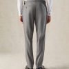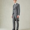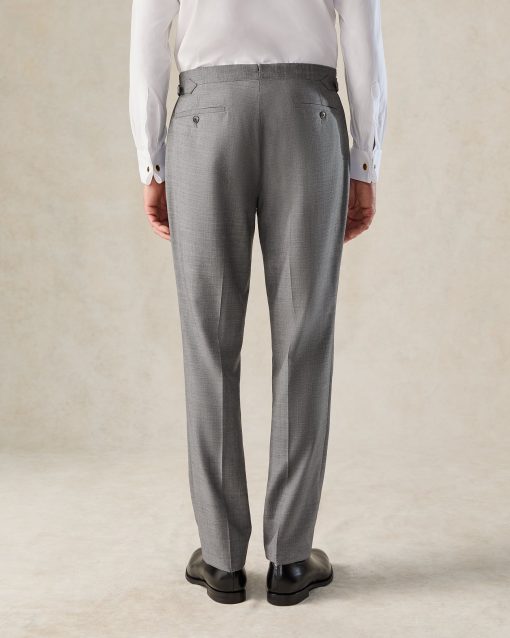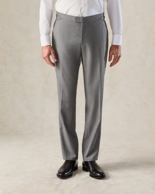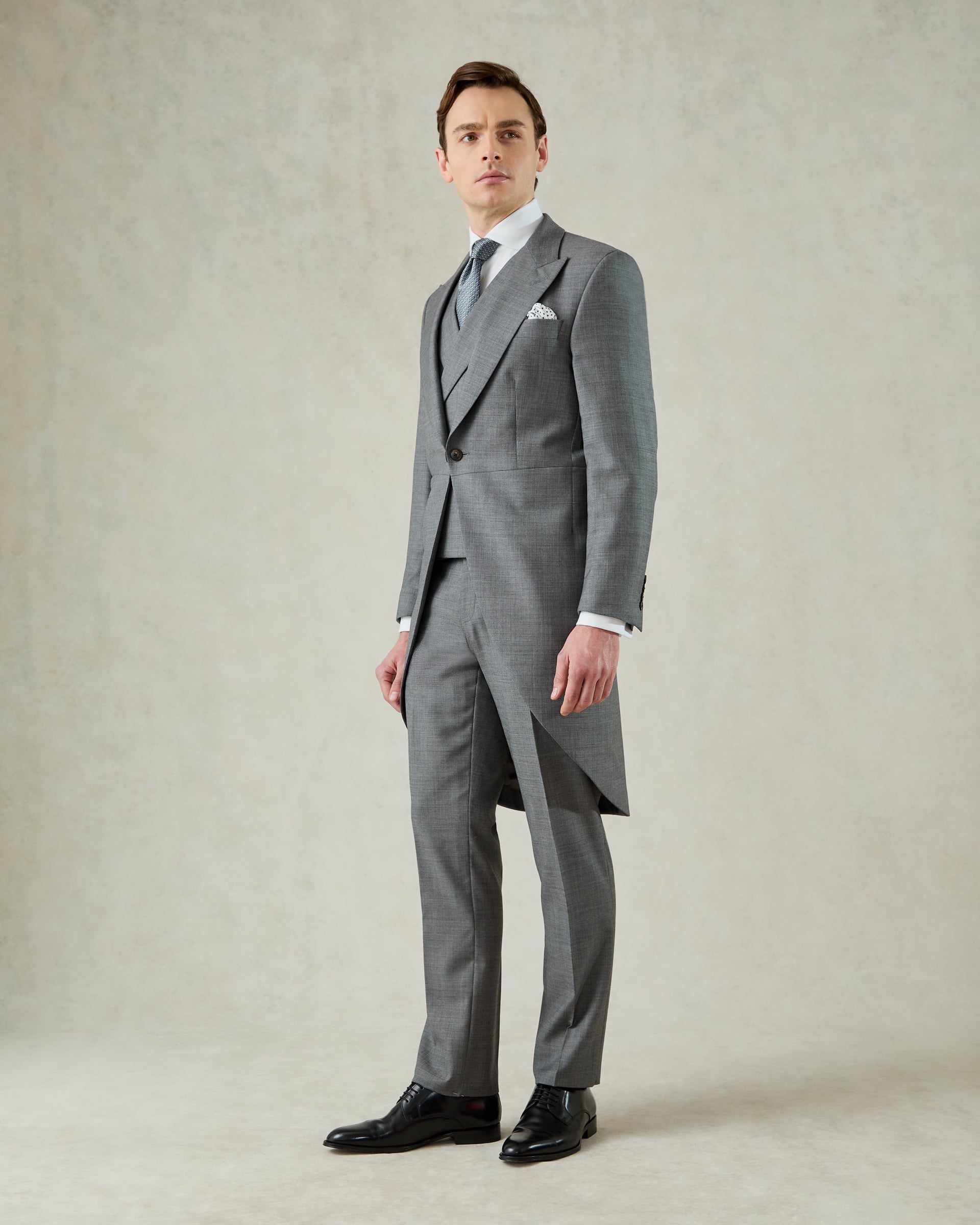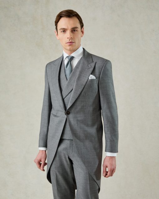 The Torlese Suit in Grey Sharkskin by Gieves & Hawkes is a masterclass in refined British tailoring that is presented as a three piece ensemble. The jacket features a single-breasted design with a peak lapel and single vent, fully lined for a smooth, comfortable fit. Complementing the jacket, the trousers are styled with a flat front, side adjusters, and a dinner split, while the vest completes the ensemble. Crafted from luxurious Italian Angelico fabric with a subtle sharkskin sheen, this suit combines traditional elegance with modern flair, making it ideal for both formal occasions and business settings.